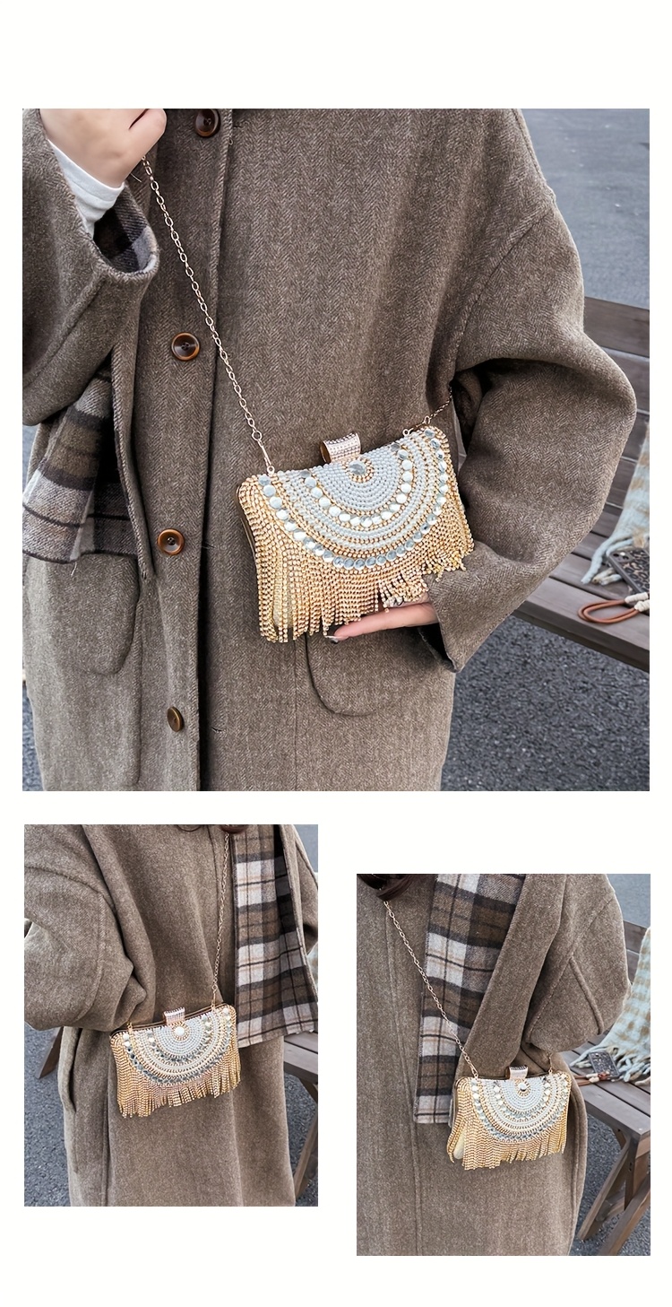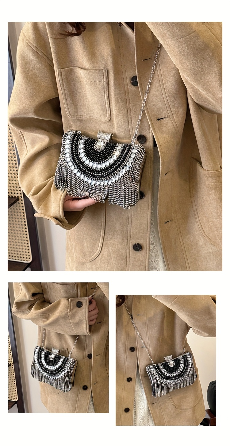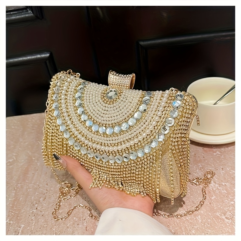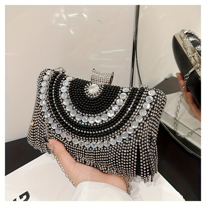 4pcs Elegant Women'S Luxury Evening Set - Diamond-encrusted Evening Dress, Full Diamond Clutch, Chain Bag, Small Handbag, Rhinestone Necklace, Earrings, Bracelet Set - Geometric Pattern, Metal Material, Buckle Closure, Polyes