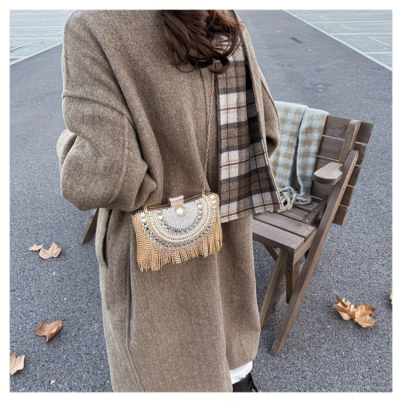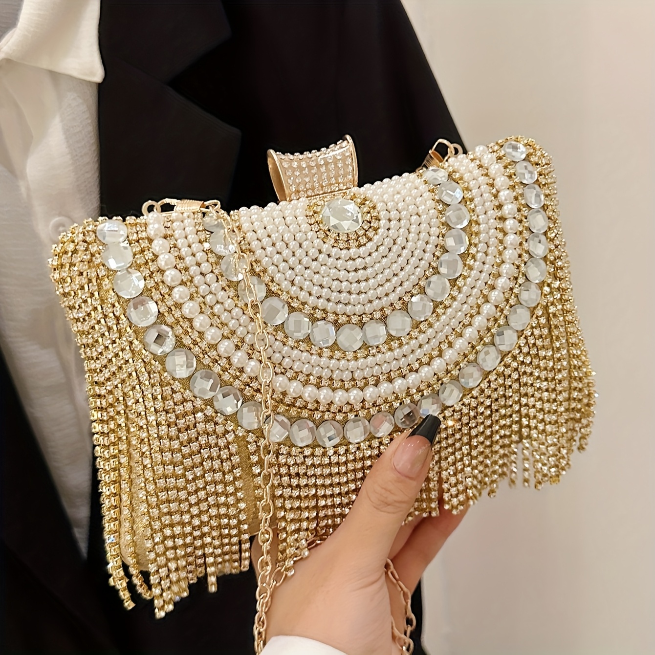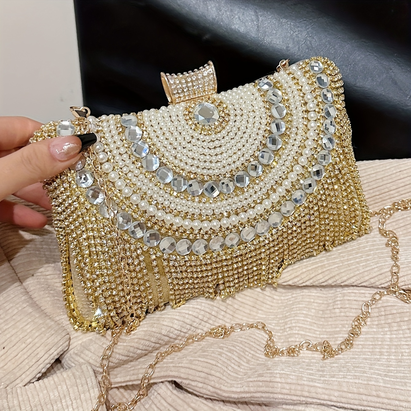4pcs Elegant Women'S Luxury Evening Set - Diamond-encrusted Evening Dress, Full Diamond Clutch, Chain Bag, Small Handbag, Rhinestone Necklace, Earrings, Bracelet Set - Geometric Pattern, Metal Material, Buckle Closure, Polyes